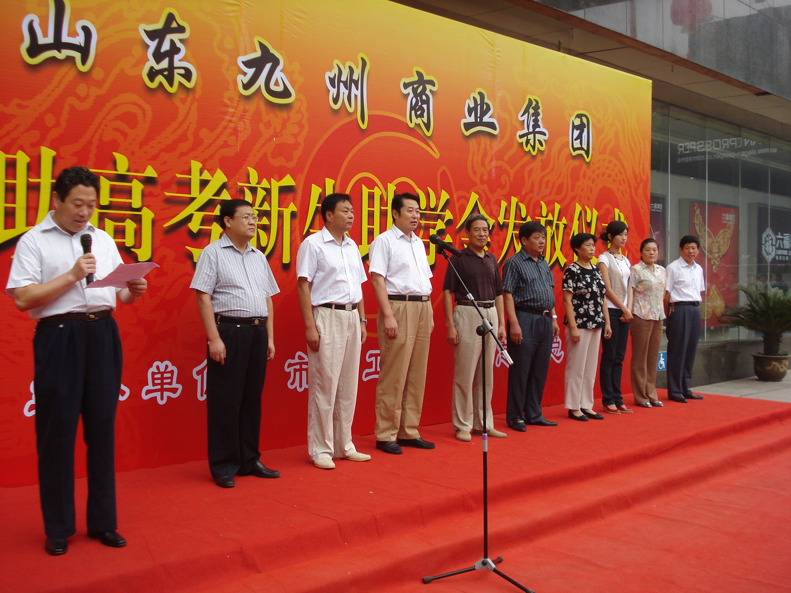 (儀式結(jié)束后領(lǐng)導(dǎo)與受助大學(xué)生合影留念) 8月25日上午,集團(tuán)在九州商業(yè)大廈前舉行山東九州商業(yè)集團(tuán)資助高考新生助學(xué)金發(fā)放儀式。50名受助大學(xué)生每人獲得了3000元的九州商業(yè)集團(tuán)助學(xué)金。市總工會黨組副書記、副主席王向群,市總工會黨組成員、副調(diào)研員張濤,市民政局副局長、市慈善總會副會長兼秘書長朱步君,市總工會生產(chǎn)保障部部長王秀麗,臨沂市城市形象大使姚宇,以及集團(tuán)領(lǐng)導(dǎo)楊本渠、張素芬、楊沂城、王佐文等同志參加助學(xué)金發(fā)放儀式。 集團(tuán)總經(jīng)理楊沂城、市總工會副主席王向群、受助大學(xué)生代表、受助大學(xué)生家長代表分別在儀式上講話。楊總在講話中表示,企業(yè)在自身不斷發(fā)展的同時,牢記報效國家、回饋社會、積極投身公益的使命,勇于承擔(dān)社會責(zé)任,熱心支持慈善事業(yè)。多年來集團(tuán)積極參與各類助學(xué)、助殘、救災(zāi)、濟(jì)困等公益活動,累計捐款捐物達(dá)數(shù)百萬元,受到社會各界的一致好評。楊總說,大學(xué)生是國家寶貴的人才資源,是民族的希望、祖國的未來,肩負(fù)著全面建設(shè)小康社會、努力構(gòu)建和諧社會、實現(xiàn)中華民族偉大復(fù)興的歷史重任。楊總勉勵受助的大學(xué)生珍惜大學(xué)的美好時光,樹立遠(yuǎn)大理想,努力學(xué)習(xí)文化知識,以知識改變命運(yùn),用優(yōu)異的成績、過硬的本領(lǐng)奉獻(xiàn)社會、報效祖國、建設(shè)家鄉(xiāng)。 市總工會副主席王向群在講話中首先向楊本渠董事長及九州商業(yè)集團(tuán)多年來積極獻(xiàn)身公益事業(yè)表示了感謝。他勉勵受助的大學(xué)生珍惜大學(xué)生活,不忘社會各界的幫助,努力學(xué)習(xí),回報社會。他希望更多的企業(yè)投身到社會慈善事業(yè)中來,讓更多的弱勢群體享受到祖國大家庭的溫暖。