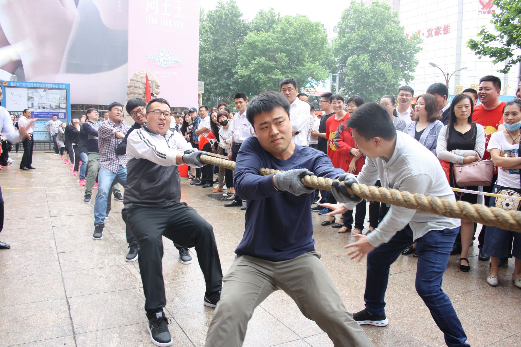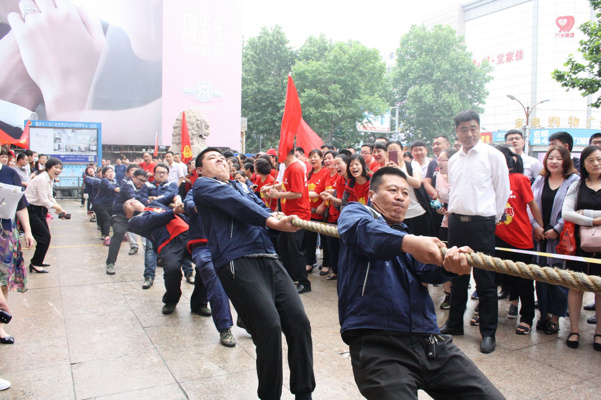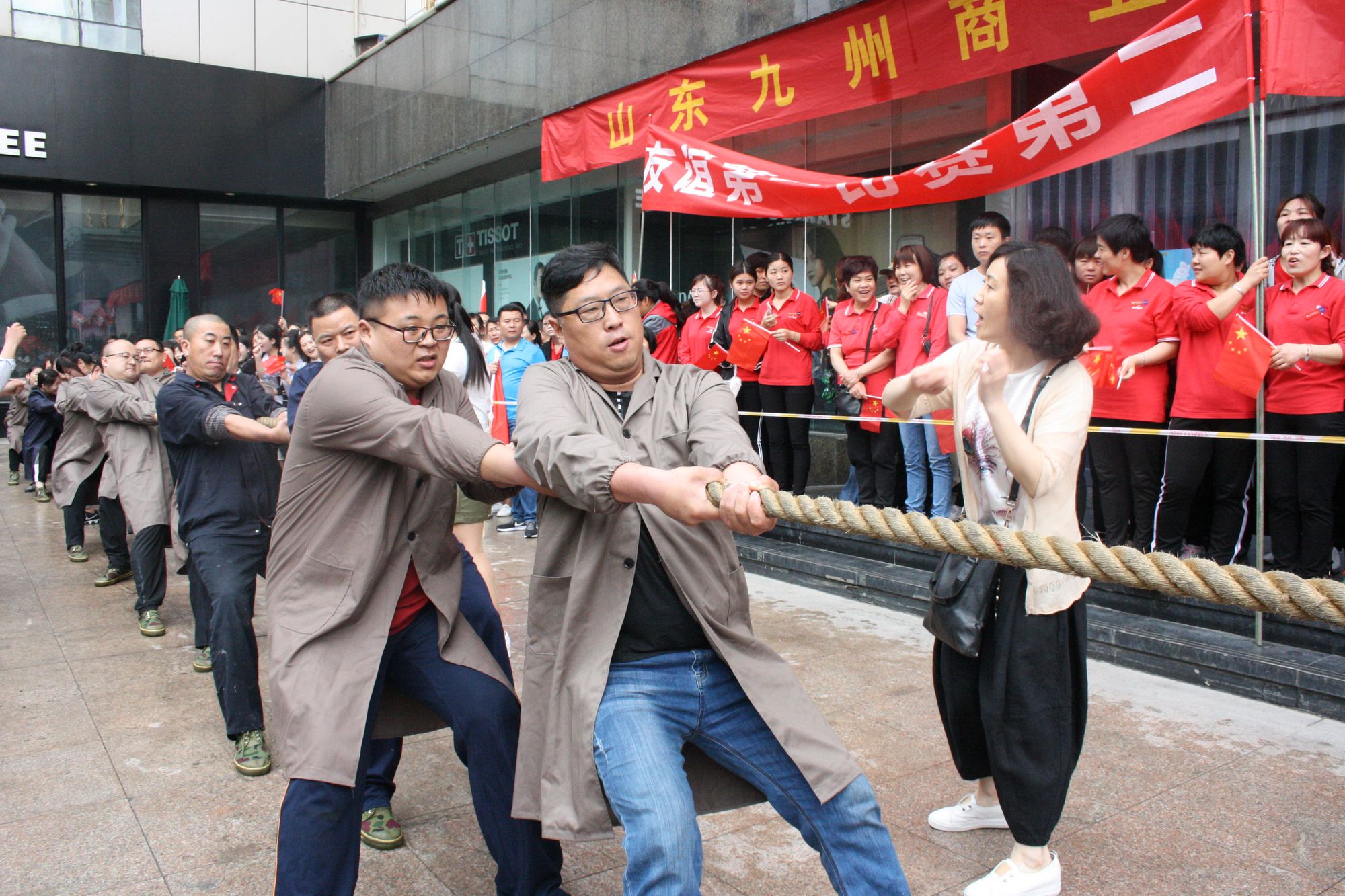 5月17日上午七點(diǎn),九州集團(tuán)2018年運(yùn)動(dòng)會(huì)拔河比賽項(xiàng)目伴著激昂的音樂(lè)在九州大廈解放路店廣場(chǎng)拉開(kāi)帷幕。來(lái)自各單位和集團(tuán)行政的六支代表隊(duì)共計(jì) 108人參加比賽。 來(lái)自各單位和集團(tuán)行政的六支代表隊(duì),已經(jīng)準(zhǔn)備就緒,蓄勢(shì)待發(fā)。一聲哨響,兩隊(duì)展開(kāi)激烈的爭(zhēng)奪,加油聲、鼓勁聲、歡呼聲此起彼伏,你爭(zhēng)我?jiàn)Z,你上我下,一片昂揚(yáng)氣氛。這是一場(chǎng)勢(shì)均力敵的較量,兩隊(duì)的比賽已經(jīng)進(jìn)入膠著狀態(tài),緊張激烈的現(xiàn)場(chǎng)氣氛將整個(gè)比賽推向了高潮;這是一場(chǎng)實(shí)力懸殊的戰(zhàn)斗,在不甘示弱的團(tuán)隊(duì)爭(zhēng)奪中,永不放棄,勢(shì)要賽出團(tuán)隊(duì)的風(fēng)采和精神。經(jīng)過(guò)激烈的角逐,來(lái)自臨沂賓館的代表隊(duì)眾望所歸奪得桂冠,九州大廈代表隊(duì)、汽貿(mào)公司代表隊(duì)分獲二、三名,九州宜家佳代表隊(duì)、超市公司代表隊(duì)、集團(tuán)行政代表隊(duì)分獲四至六名。 拔河比賽是九州集團(tuán)運(yùn)動(dòng)會(huì)上延續(xù)多年的比賽項(xiàng)目,一年又一年的榮譽(yù)爭(zhēng)奪,承載著九州人團(tuán)結(jié)一心、頑強(qiáng)拼搏的信念堅(jiān)持;展現(xiàn)著九州人昂揚(yáng)向上、積極進(jìn)取的精神風(fēng)貌。(集團(tuán)辦公室 劉傳芳)