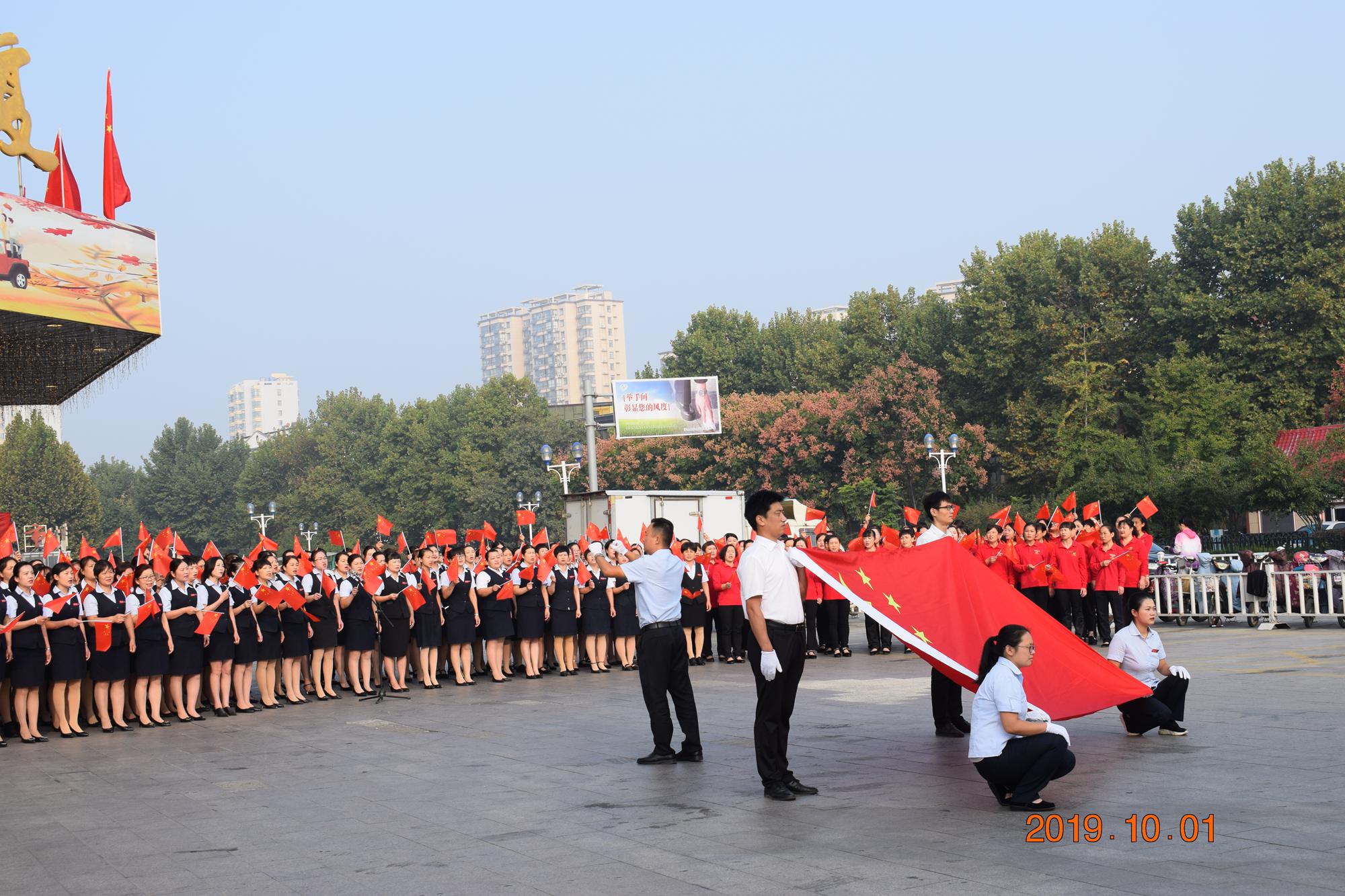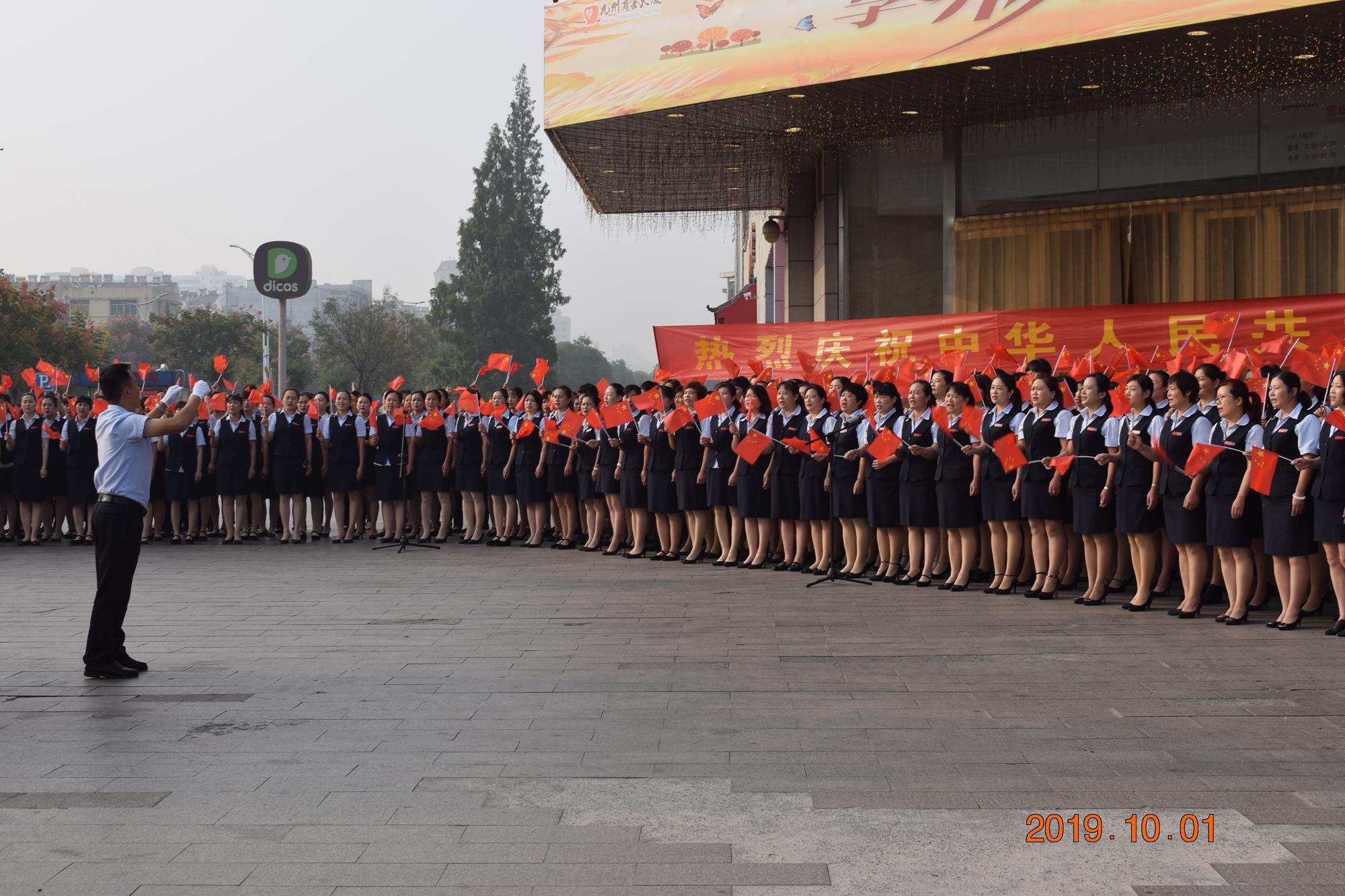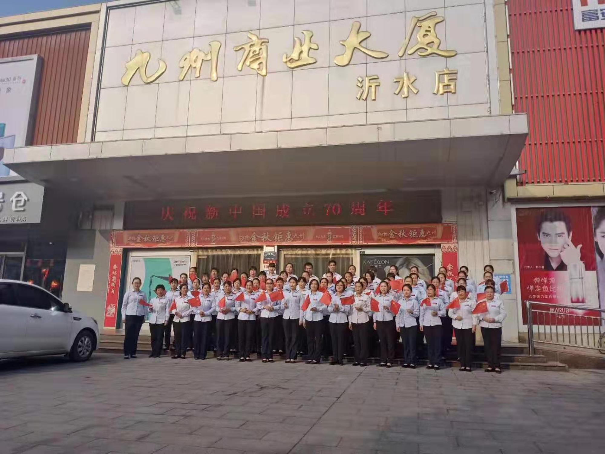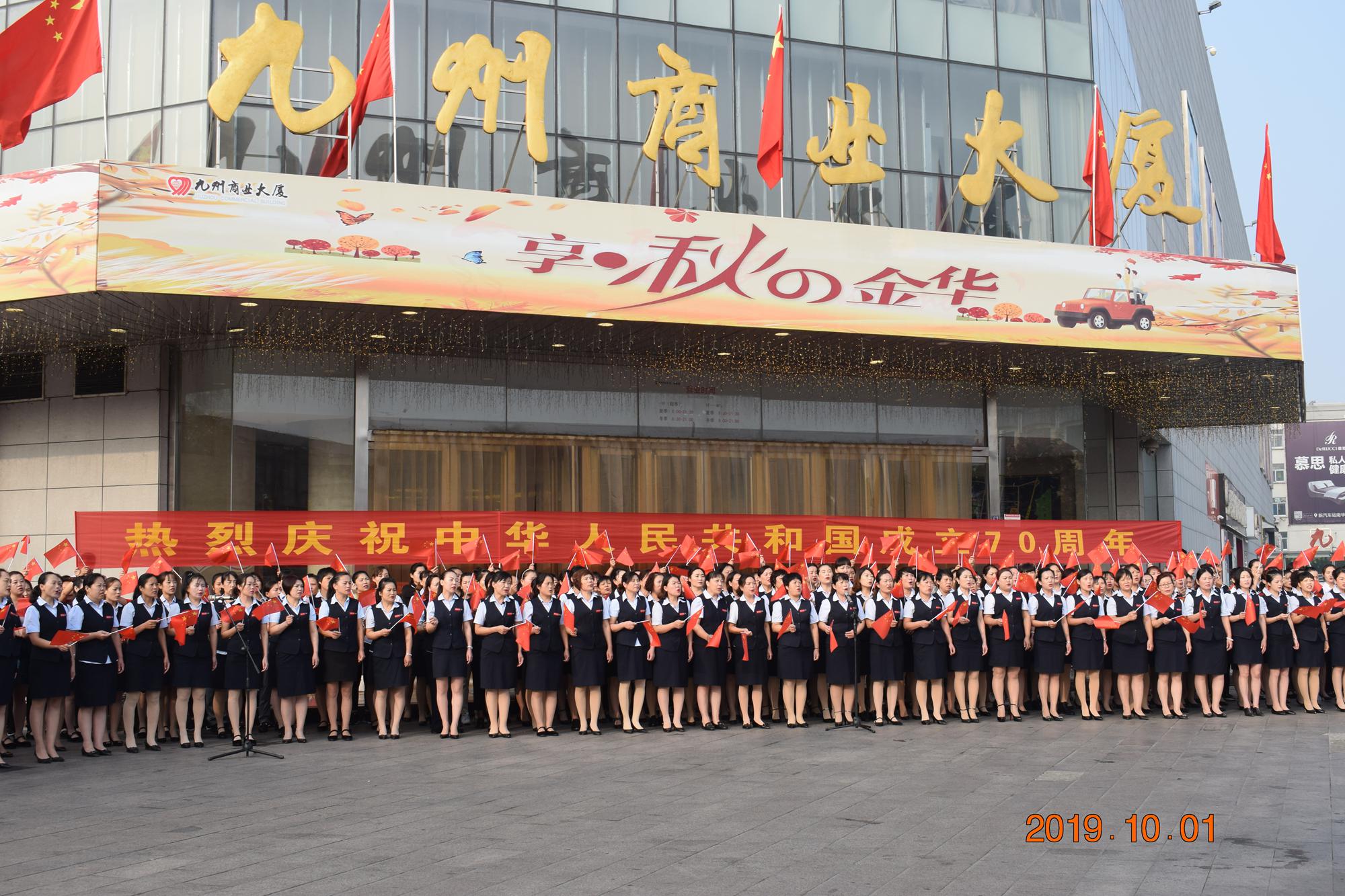 10月1日上午,九州商業(yè)大廈沂水區(qū)域門店分別在各店門前廣場舉行了慶國慶合唱活動。先后合唱了《我和我的祖國》、《九州集團(tuán)之歌》等歌曲。
