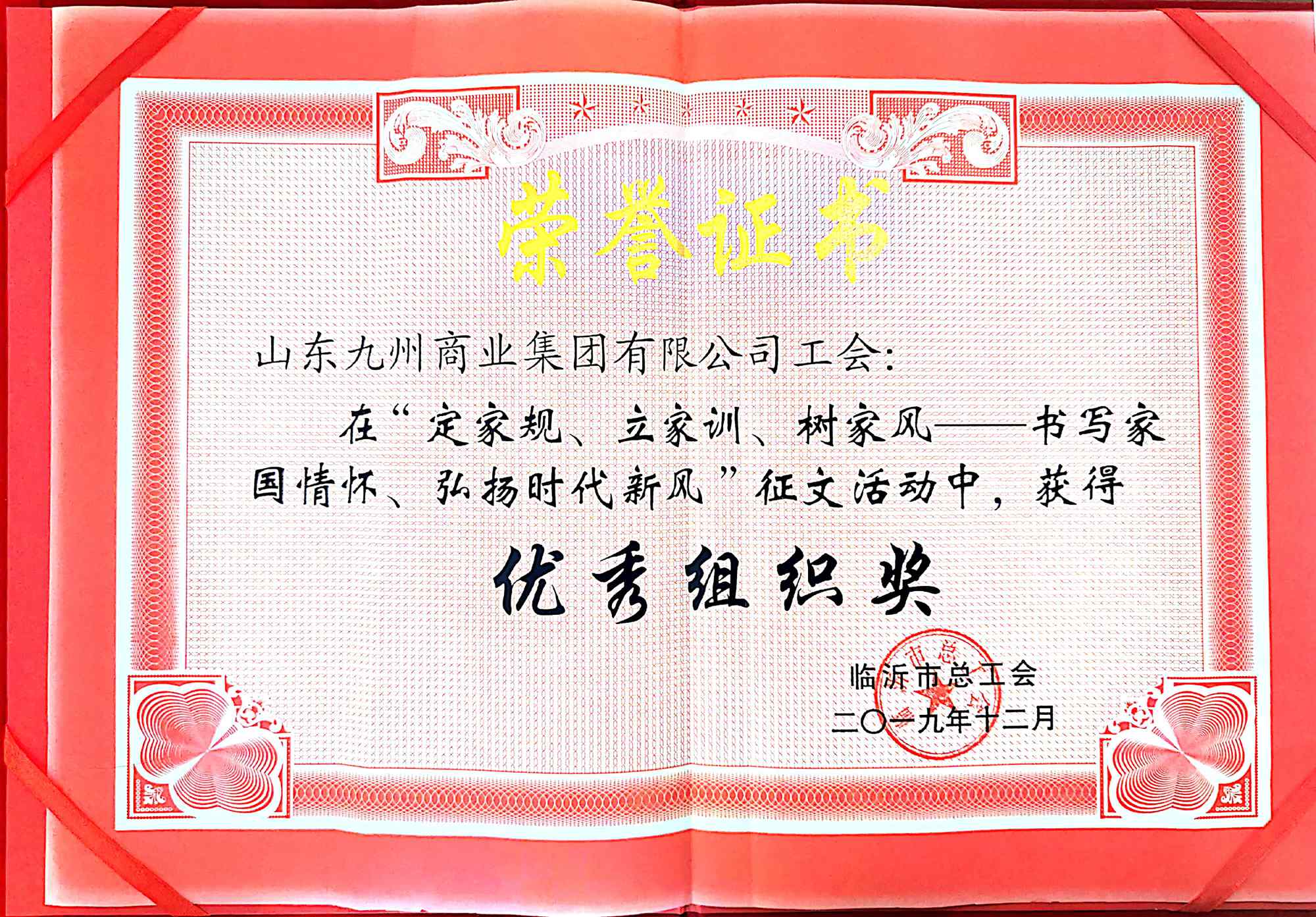 2019年12月24日,臨沂市總工會(huì)對在全市廣大女職工中開展的“定家規(guī)、立家訓(xùn)、樹家風(fēng)——書寫家國情懷、弘揚(yáng)時(shí)代新風(fēng)”活動(dòng)的獲獎(jiǎng)情況進(jìn)行了通報(bào)表彰。本次征文大賽分“我的家規(guī)家訓(xùn)故事”和“一封家書傳親情說家風(fēng)”兩大主題。九州集團(tuán)女職工在本次征文大賽中表現(xiàn)突出,共獲一等獎(jiǎng)1個(gè)、三等獎(jiǎng)2個(gè)、優(yōu)秀獎(jiǎng)11個(gè),集團(tuán)工會(huì)榮獲“優(yōu)秀組織獎(jiǎng)”。 李金衛(wèi)的作品《給兒子的一封信》在“一封家書傳親情說家風(fēng)”主題征文中榮獲一等獎(jiǎng)。作者充滿深情地道出撫養(yǎng)教育孩子成長的辛苦歷程,既有對往事的回憶感慨,也有對未來的熱切期待,字里行間透露出一位母親對孩子深沉的愛。樸素的文字道出了教育的真諦,讀來令人受益匪淺。 本次征文大賽活動(dòng),集團(tuán)工會(huì)高度重視,精心組織,發(fā)動(dòng)集團(tuán)各單位女職工踴躍參加,共收到投稿230余篇,精選了68篇優(yōu)秀作品予以選送。市總工會(huì)特為企業(yè)作一專集,在齊魯工會(huì)平臺進(jìn)行展示,并通過微信沂蒙公眾號逐篇進(jìn)行展示。市總工會(huì)授予集團(tuán)工會(huì)等35家企事業(yè)單位工會(huì)“優(yōu)秀組織獎(jiǎng)”榮譽(yù)稱號。 講家庭故事,傳親情家書;顒(dòng)的開展激勵(lì)著我們進(jìn)一步樹立新時(shí)代家規(guī)家訓(xùn),切實(shí)推動(dòng)社會(huì)主義核心價(jià)值觀在家庭落細(xì)落實(shí),以小家庭的和諧共建大社會(huì)的和諧,為加快建設(shè)新時(shí)代“大美新”臨沂作出新的更大的貢獻(xiàn)。(集團(tuán)辦公室)