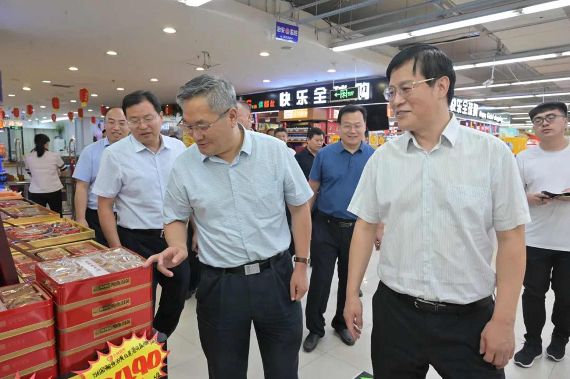 中秋國慶佳節(jié)來臨之際,9月25日上午,市政府副市長劉賢軍帶隊到九州購物中心河東店等地檢查食品安全工作。市市場監(jiān)管局黨組書記、局長黃杰,河東區(qū)委副書記、區(qū)長姚運明,集團董事長、總經(jīng)理楊永東,超市公司總經(jīng)理李國等陪同。