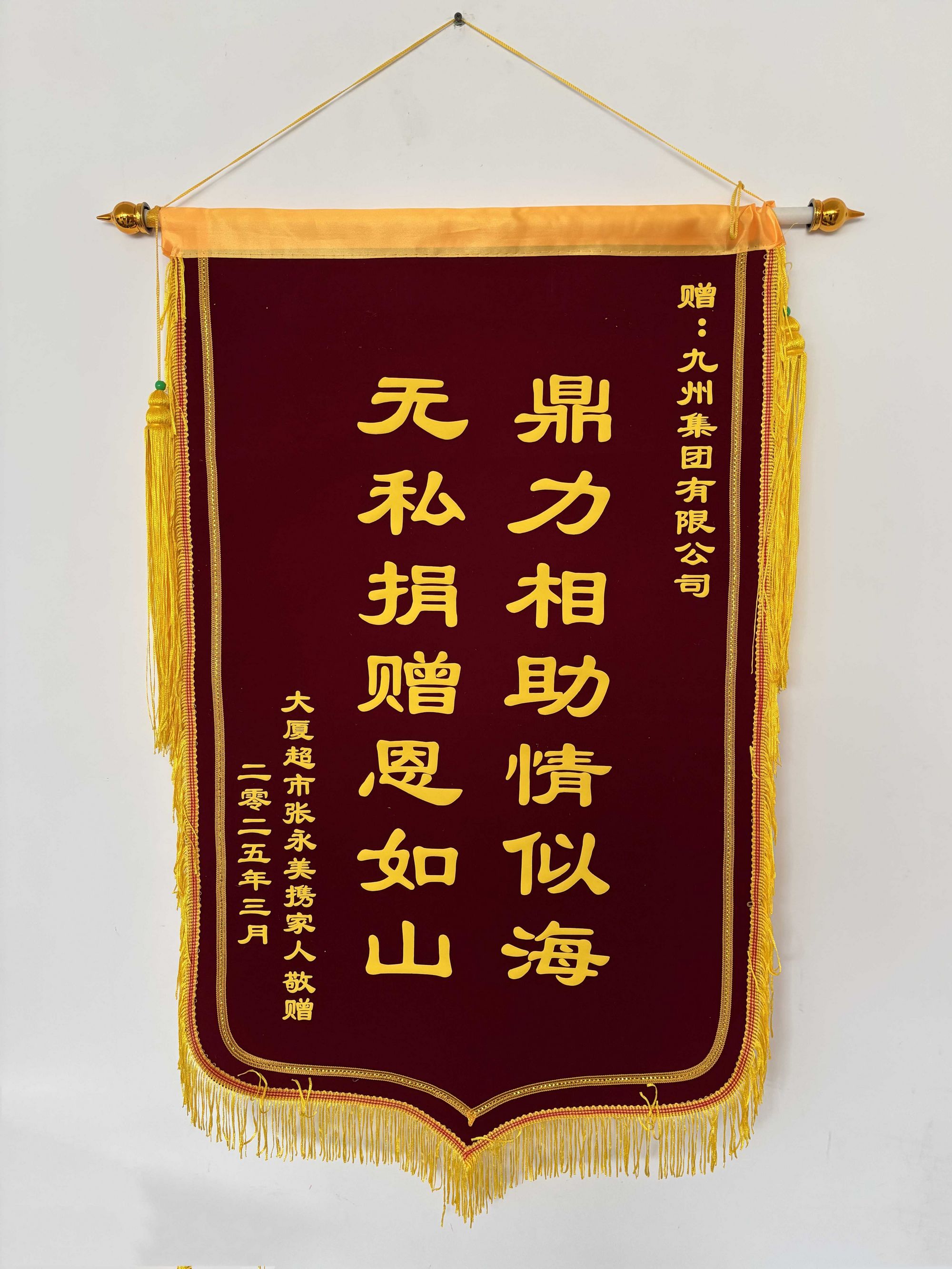 3月6日上午,一面寫(xiě)有“鼎力相助情似海,無(wú)私捐贈(zèng)恩如山”的錦旗及一封感謝信送到了九州集團(tuán),為這個(gè)忙碌的工作日增添了一抹溫馨色彩。