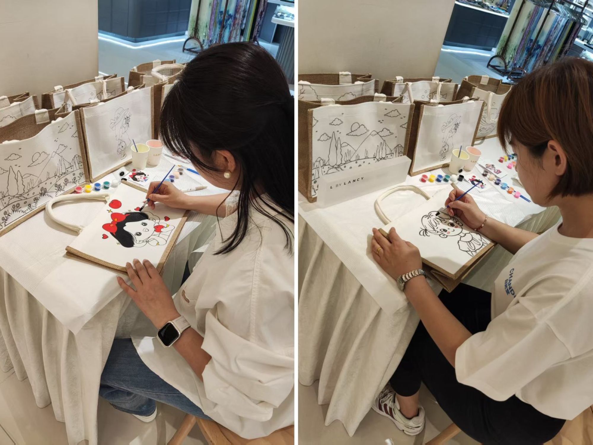 活動現(xiàn)場,朗姿店長徐慶芝從色彩搭配、圖案設計及繪畫技巧等方面對顧客進行全程指導,極大地激發(fā)了大家的創(chuàng)作熱情和靈感,很快一件件獨具風格的時尚手包便呈現(xiàn)出來。