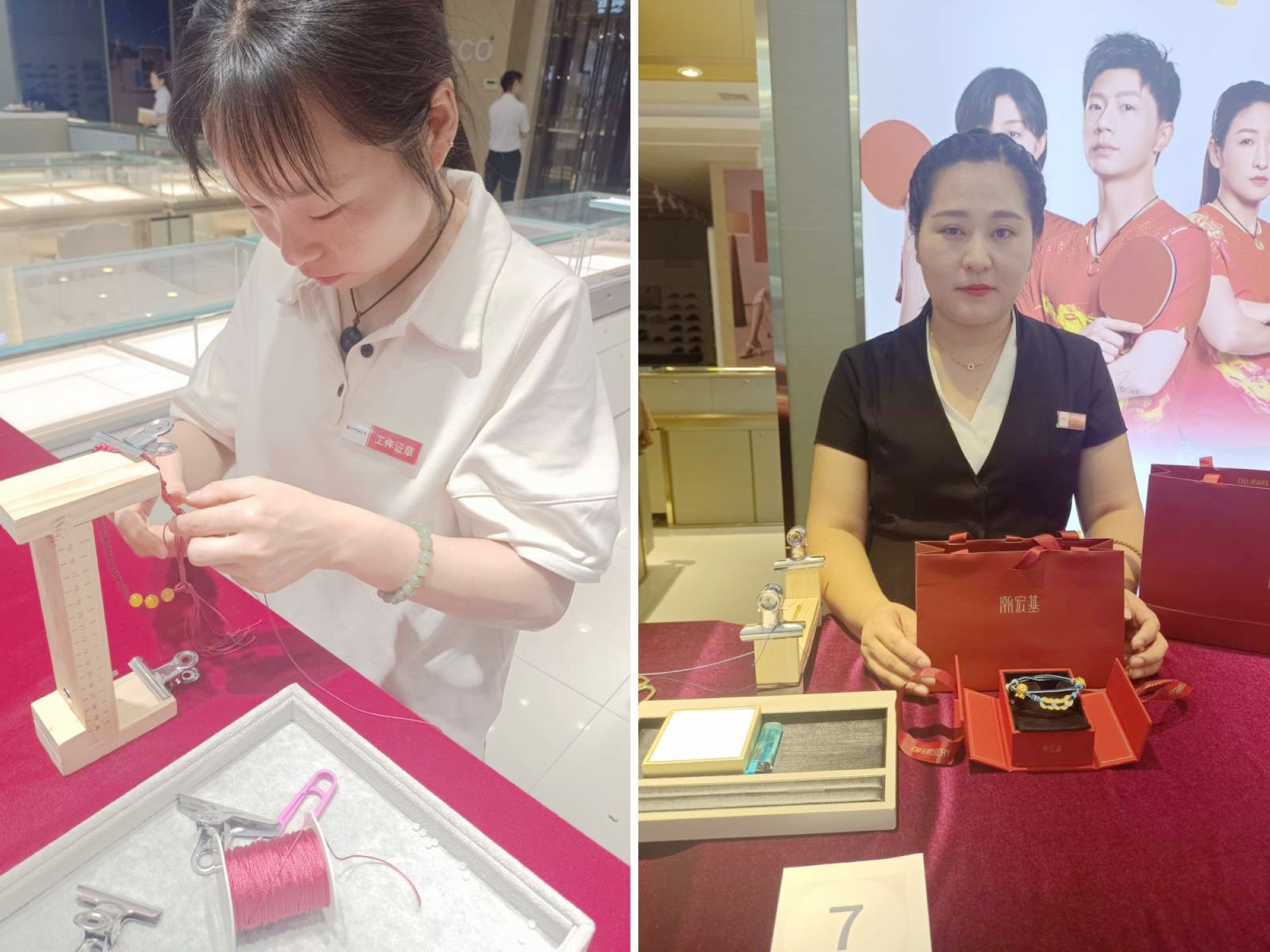 比賽中,參賽員工選線配色,利用四股編、八股編、十六股編等多種編織手法,選用象征祝福與守護的珠寶配飾,編織出寓意著繁榮“父”強、健康平安、父愛永恒、平安喜樂的的手鏈和鑰匙扣等作品。10名評委根據(jù)色彩搭配、手工藝、創(chuàng)意解說等環(huán)節(jié)進行了評分,最終,潮宏基孫丙云編織的繁榮“父”強手鏈榮獲一等獎;六福珠寶莊金梅的“健康平安”手鏈和中國黃金珠寶高以菊的“平安喜樂”鑰匙扣榮獲二等獎;周大福王錦秋的“平安祥和”、謝瑞麟張傳榮“平安吉慶”和明牌盧小麗的“父愛永恒”手鏈榮獲三等獎。