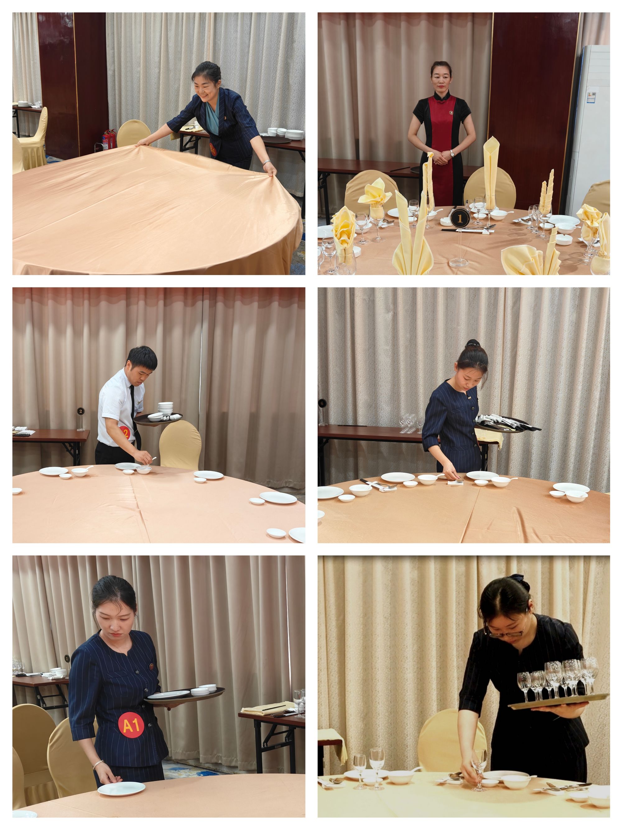 本次技能比武項(xiàng)目為餐廳中餐宴會(huì)擺臺(tái),比賽分為員工組和基層管理人員組,現(xiàn)場(chǎng)抽簽決定參賽順序。賽場(chǎng)上,選手們?nèi)褙炞ⅲ谝?guī)定的時(shí)間內(nèi),憑借自己的專業(yè)技能,將一張張普通的餐桌布置成既美觀又實(shí)用的用餐環(huán)境。鋪?zhàn)啦紩r(shí)行云流水,定位餐具時(shí)快速均,餐巾折花綻放栩栩如生的造型,每一個(gè)細(xì)節(jié)都彰顯著選手們?cè)鷮?shí)的功底與精益求精的技藝。經(jīng)過評(píng)委綜合評(píng)比,開發(fā)區(qū)店餐廳部薛會(huì)娜和陳彩霞分獲基層管理人員組和員工組第一名;宗龍星、丁朝陽分獲基層管理人員組第二、第三名,付振云、房桂宇分獲員工組第二、第三名。