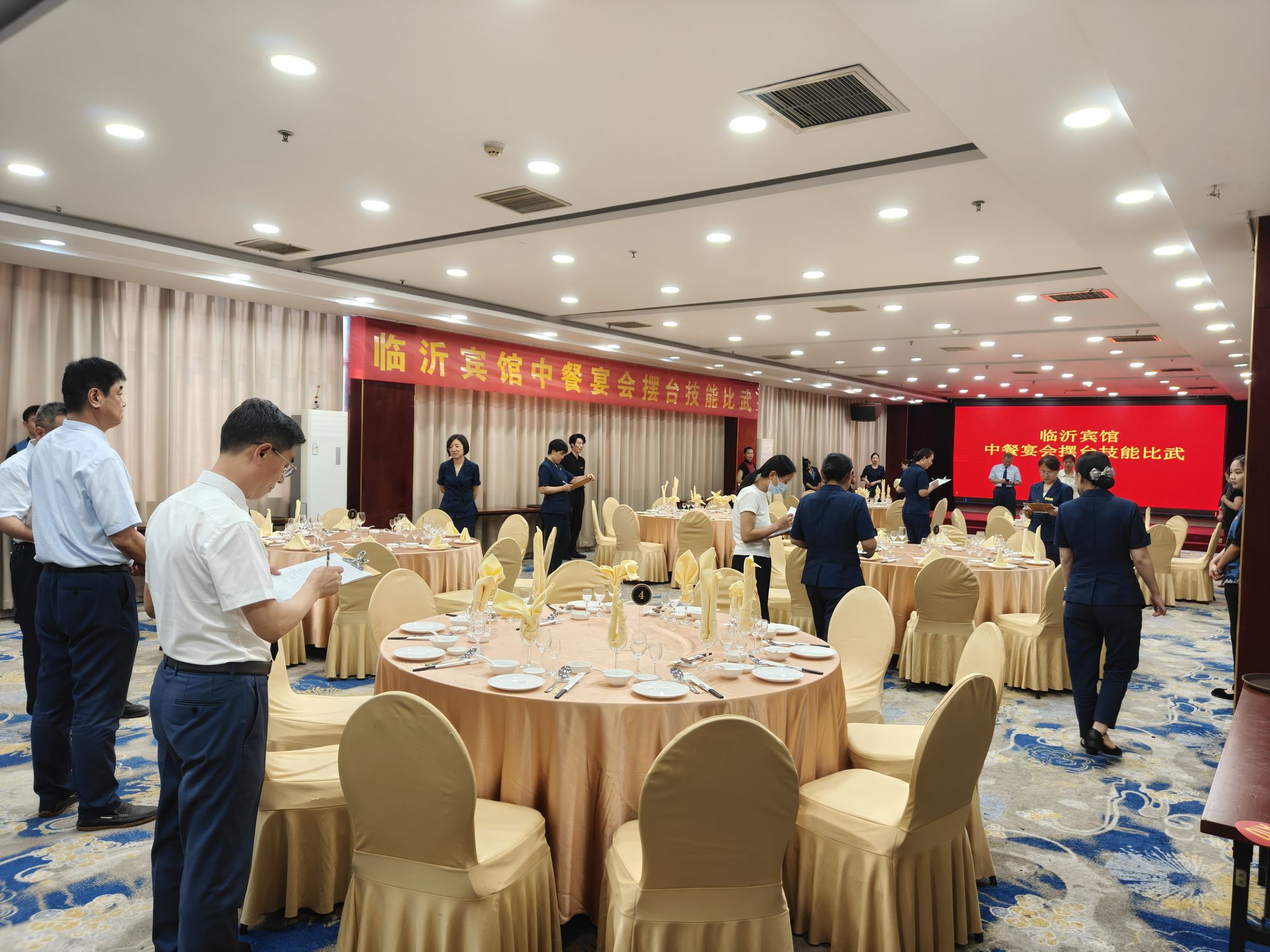 6月24日下午,臨沂賓館2025年餐廳技能比武在沂蒙路店貴賓樓蒙山廳舉行。經(jīng)過選拔,共有18名選手參加。