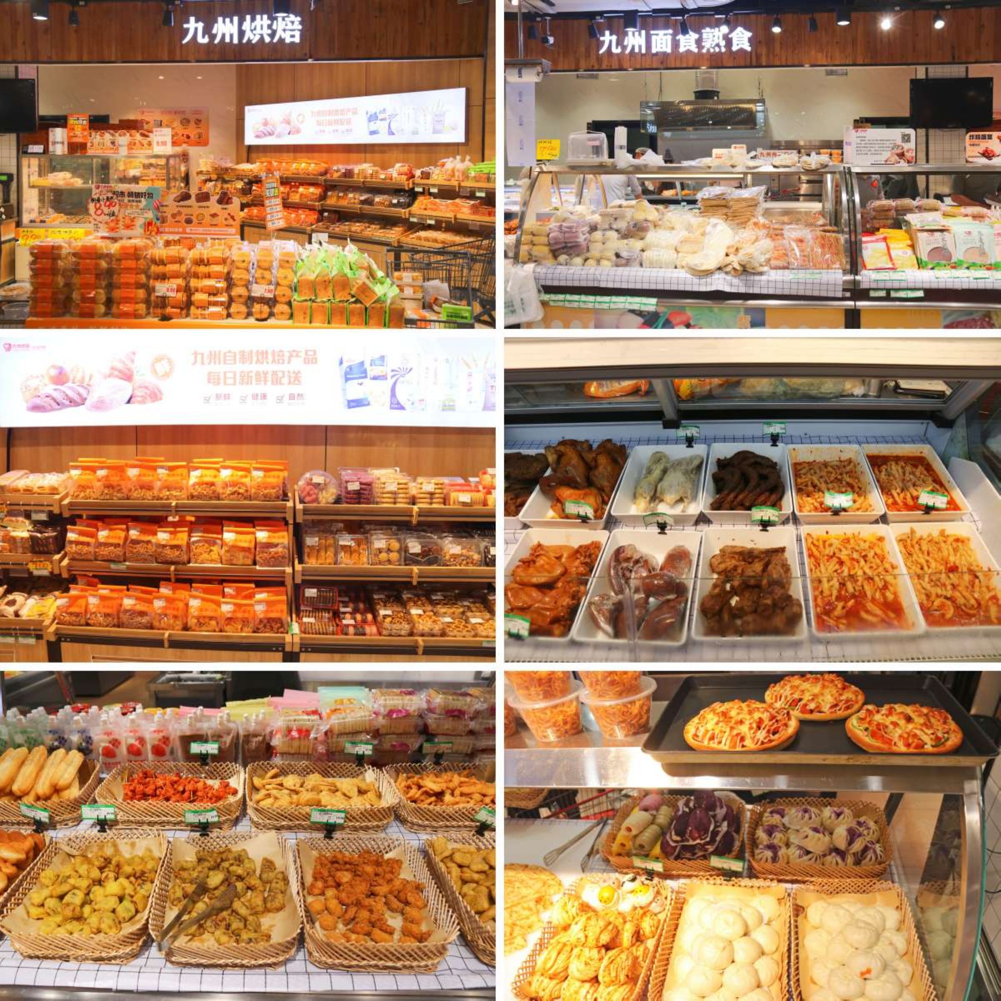 在面食、熟食及烘焙區(qū),各檔口煙火氣十足,F(xiàn)場(chǎng)手工制作的面食琳瑯滿目,有蔥油餅、醬香餅、花樣饅頭等品類;熟食區(qū)鹵香四溢,有豬頭肉、豬耳朵、鴨脖、鴨頭等品類,令人饞涎欲滴;烘焙區(qū)的現(xiàn)烤蛋撻、披薩等,香氣四溢;還有牙簽肉、黑椒雞塊、茄盒等小吃類,口味多樣;品類從主食到佐餐,從熱食到小吃,全品類現(xiàn)做現(xiàn)售,保證食材新鮮,能有效滿足顧客的消費(fèi)需求。