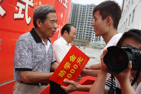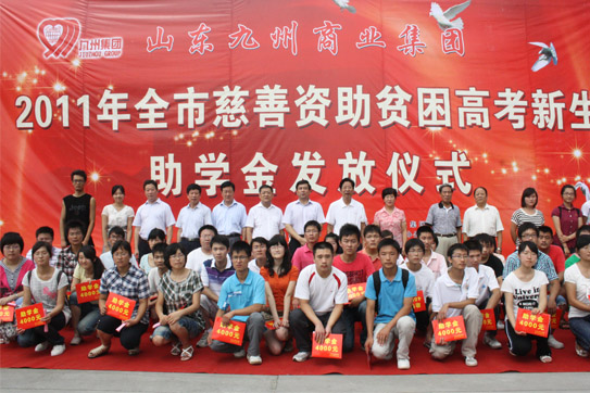 | 8月12日,2011年度山東九州商業(yè)集團(tuán)資助貧困高考新生助學(xué)金發(fā)放儀式在臨沂賓館大學(xué)酒店舉行。50名在今年高考中取得優(yōu)異成績(jī)的貧困新生每人領(lǐng)到了4000元九州慈善助學(xué)金。市委常委、市總工會(huì)主席林祥余、市政協(xié)副主席趙愛(ài)華、市人大常委會(huì)法工委主任殷洪舉、市民政局局長(zhǎng)姜新利、市紀(jì)委派駐五組副書(shū)記王培成、市慈善總會(huì)副會(huì)長(zhǎng)楊本渠、集團(tuán)董事長(zhǎng)楊沂城、集團(tuán)黨委書(shū)記王佐文等出席儀式。 市慈善總會(huì)副會(huì)長(zhǎng)楊本渠為貧困大學(xué)生發(fā)放助學(xué)金