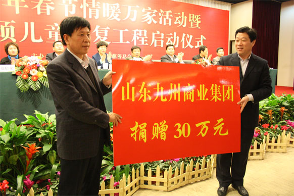 12月10日,2012年臨沂市新年春節(jié)情暖萬家活動啟動儀式在臨沂賓館舉行,活動現(xiàn)場同時舉行了斜頸兒童康復工程啟動儀式,并為困難家庭發(fā)放了資助金。市政協(xié)副主席趙愛華,市直有關部門領導出席啟動儀式。 活動現(xiàn)場,九州集團向臨沂市慈善總會捐款30萬元,用于資助困難家庭。集團黨委書記王佐文出席啟動儀式并代表集團進行了現(xiàn)場捐贈。