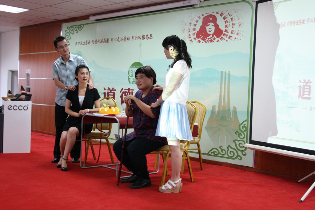 大廈員工在表演根據(jù)身邊真實(shí)故事改編的短劇《生日》